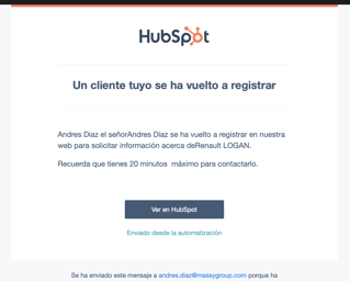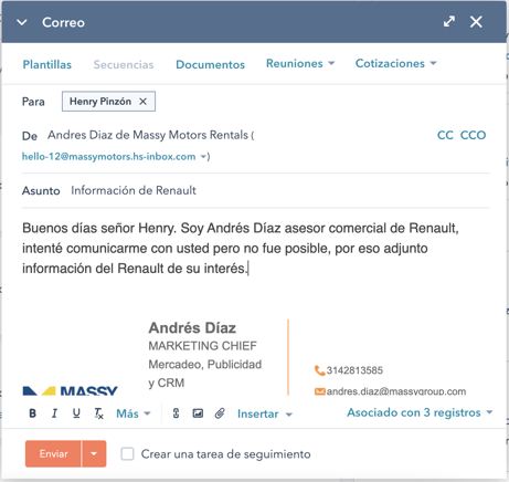 Si el cliente no contesta la llamada, deberás enviar un correo electrónico con información del vehículo de interés del cliente y tus datos personales, indicándole que intentaste comunicarte con el/ella por teléfono y no fue posible. Esto podrás hacerlo haciendo click en el botón de email en Hubspot.