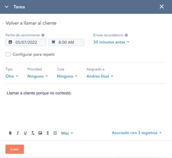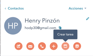 Para crear una tarea solo debes hacer click en el botón "Crear tarea" de Hubspot