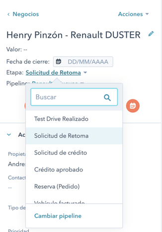 A medida que vayas conversando con el cliente deberás actualizar la etapa del negocio del cliente a la etapa que mejor describa el estado del cliente.
